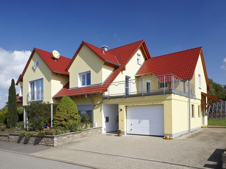 - Satteldach mit einem Querbau und 3 Gauben mit je 42° Dachneigung