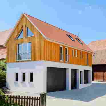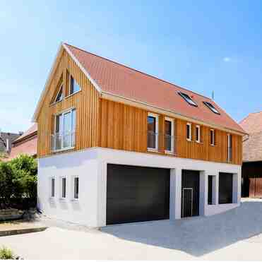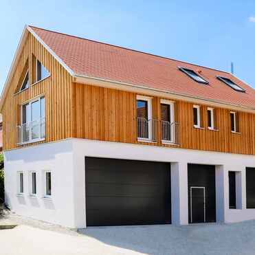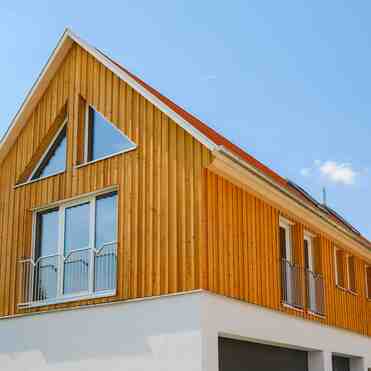 - Holzrahmenbau / Putzfassade / senkrechte Holzverschalung