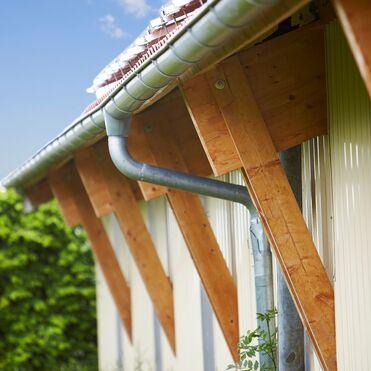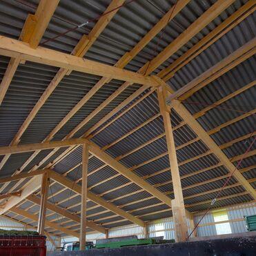 - Wände als Pfosten-Riegel-Konstruktion, Dachstuhl als Binderkonstruktion
